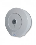Dispensador de papel higiénico con cerradura de seguridad, fabricado en plástico ABS resistente color blanco/gris, capacidad 1 rollo de 12 / 600 metros, dimensiones: 35 x 35 x 14 cm. Modelo PH52300, marca Jofel.
