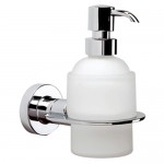 Dosificador de jabón a muro, terminado cromado, medida de 14.2 cm de alto, 7.9 cm de ancho y proyección de 12.7 cm