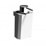 Dosificador de jabón, realizado en Solid Surface, con versión a pared y sobre encimera. Dimensiones: 81 mm x 152 mm x 111 mm. Color Blanco, acabado en Cromo. Modelo S156252, marca Wasser.