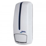 Dosificador de jabon rellenable, color blanco con aplique en azul, dimensiones 265x100x90mm, capacidad 800ml. Modelo: AC96000, marca JOFEL.
